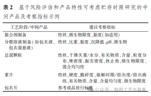 國(guó)內(nèi)外 GMP 均提及中間產(chǎn)品和待包裝產(chǎn)品應(yīng)當(dāng)在適當(dāng)?shù)臈l件下貯存,應(yīng)對(duì)生產(chǎn)的每一階段設(shè)定完成時(shí)限,以確保藥品質(zhì)量。制藥企業(yè)在制劑生產(chǎn)過程中,不可避免地存在中間產(chǎn)品短暫貯存的情況,應(yīng)該確定中間產(chǎn)品可接受的保存期限,以確保在下一工藝步驟前符合相應(yīng)的質(zhì)量標(biāo)準(zhǔn)。參照 WHO 保持時(shí)間研究一般指南 [9],中間產(chǎn)品的貯存時(shí)限通常應(yīng)該在產(chǎn)品上市前確定,可在產(chǎn)品開發(fā)中試規(guī)?;蚺糠糯筮^程中進(jìn)行,并在商業(yè)化生產(chǎn)規(guī)模工藝驗(yàn)證中進(jìn)行確認(rèn)。可采用一批至多批樣品,或根據(jù)風(fēng)險(xiǎn)評(píng)估確定研究所用的批次數(shù)量。應(yīng)采用與實(shí)際生產(chǎn)階段相一致的環(huán)境條件和容器,或采用相同材質(zhì)的模擬容器。建議對(duì)獲得的數(shù)據(jù)進(jìn)行統(tǒng)計(jì)學(xué)分析,以確定趨勢(shì),并證明貯存時(shí)限設(shè)置的合理性。以包衣片為例,提供了可考慮進(jìn)行貯存時(shí)限研究的中間產(chǎn)品及考察指標(biāo)作為參考,見表 2。